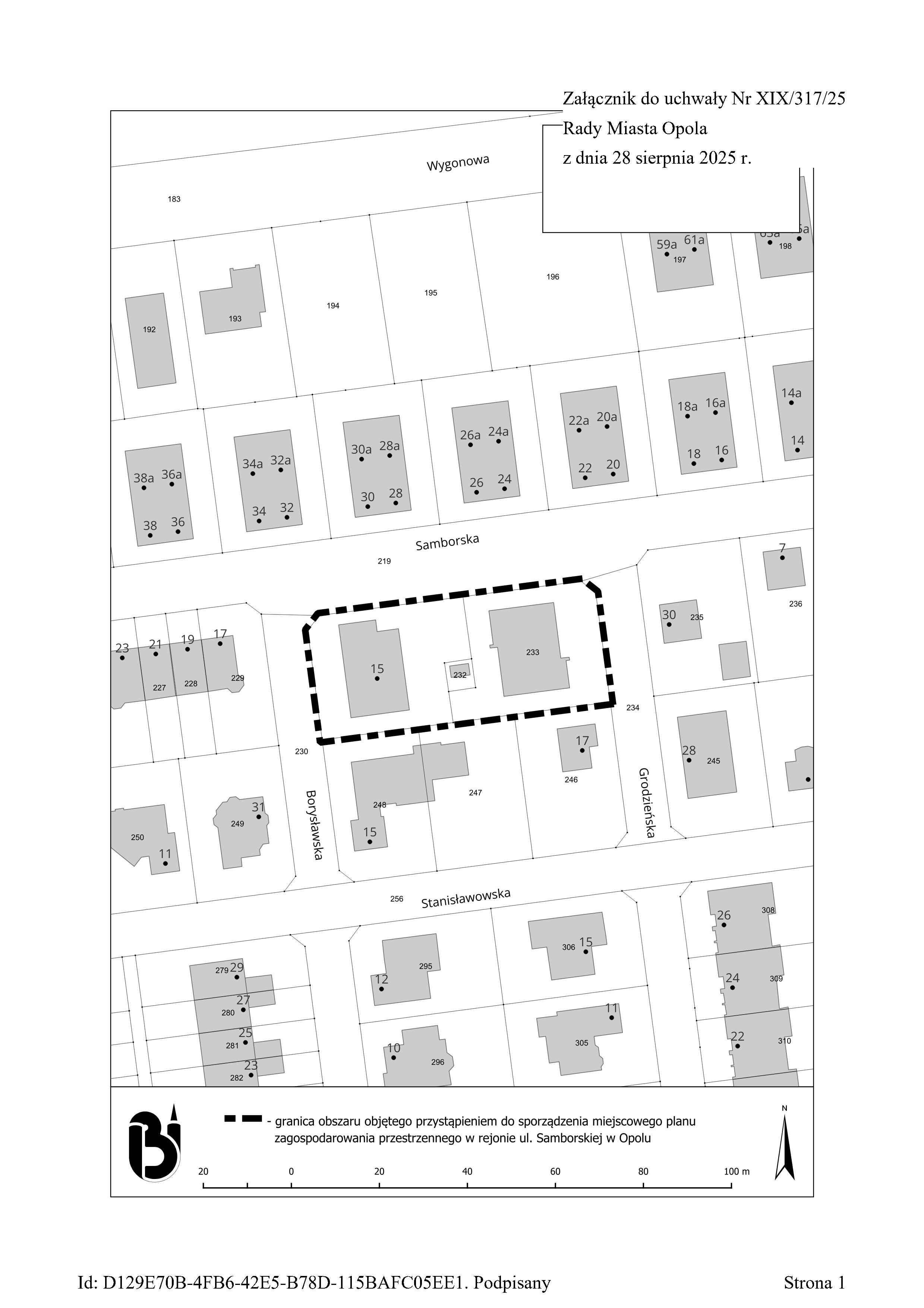 | I. | Uchwała nr XIX/317/25 Rady Miasta Opola z dnia 28 sierpnia 2025 r. w sprawie przystąpienia do sporządzenia miejscowego planu zagospodarowania przestrzennego w rejonie ulicy Samborskiej w Opolu Dane przestrzenne: | 28 sierpnia 2025 r. |